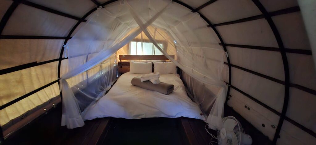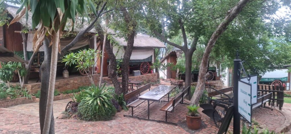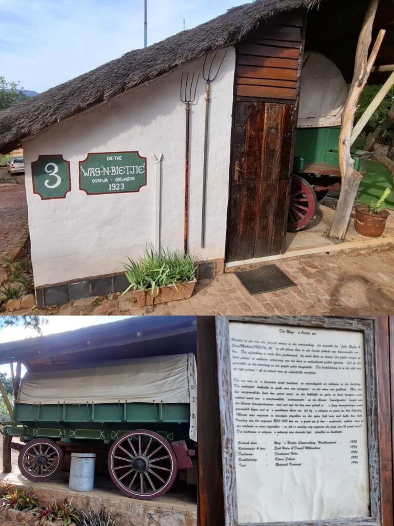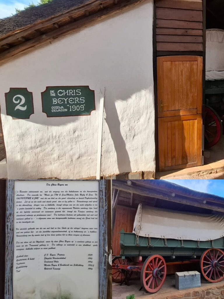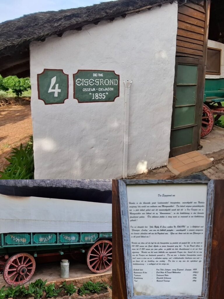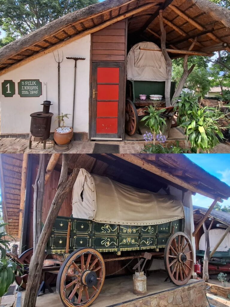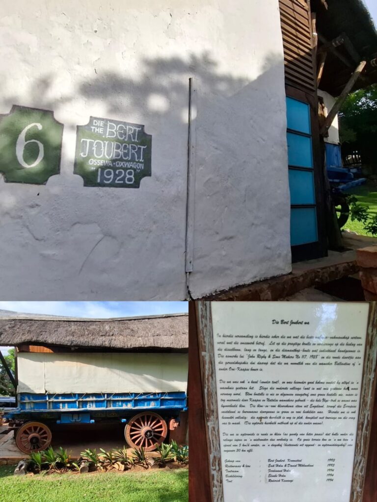 Ses Ossewaens in ‘n laer getrek, ten volle gerestoureer deur Prof Erik Holm. Die slaapgedeelte is binne die ossewa self. Elke ossewa is aan ‘n hartbeeshuisie gekoppel met ‘n sitkamertjie of ektra slaapplek en ‘n badkamer. En moet nie die moderne byvoeging vergeet nie …elektrisiteit!