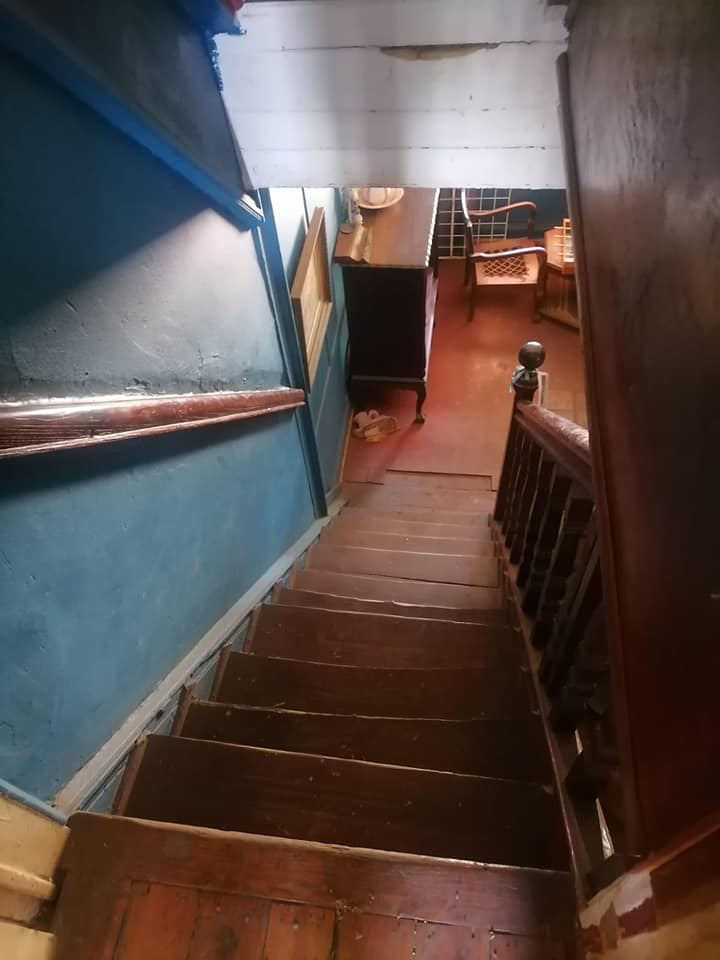 Dubbelverdieping woning met ‘n baie smal trap. Dit moes baie moeilik gewees het op en af met lang rokke , die tipiese Engelse modes van daardie tyd. Die gladde houttrappe getuig van baie voete wat oor die jare hier getrap het.