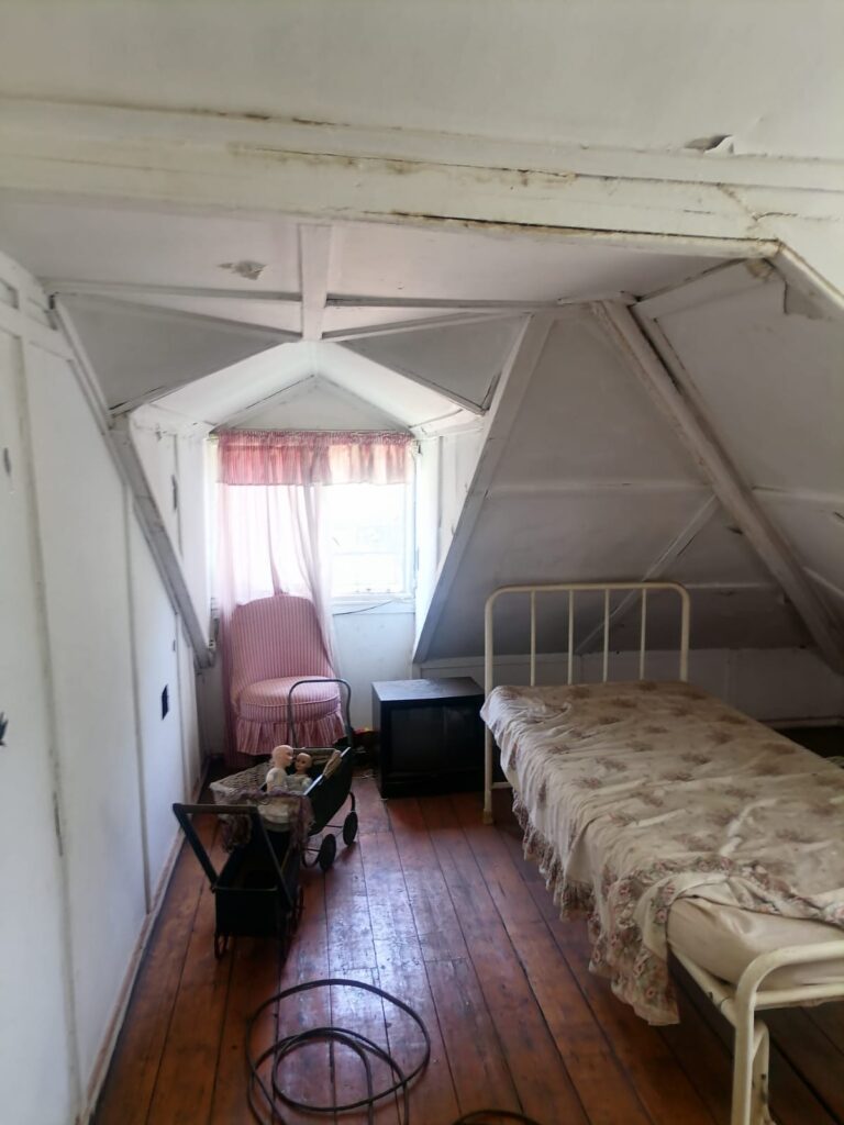 Klein kamertjies op boonste verdieping met snaakse hoeke en draaie.