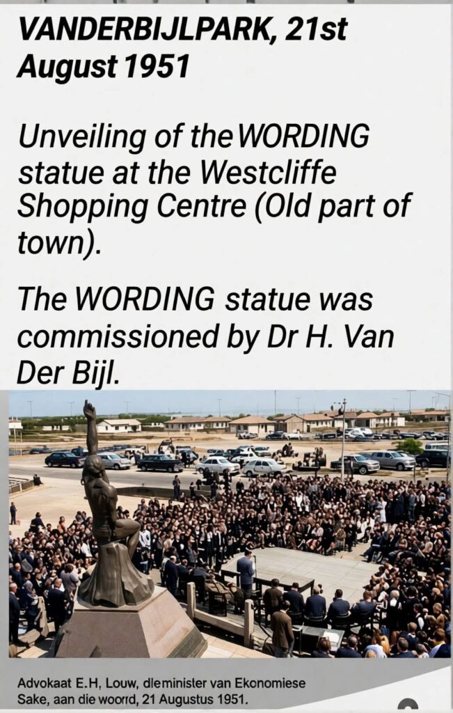 Onthul 2 Aug 1951 by Westcliffe winkelsentrum CW2, tydelike winkelsentrum. In voetstuk word toegemessel bottel brandewyn en 1951 pennie.